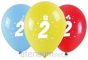 Balony kolorowe wykonane z naturalnego lateksu z obustronnym nadrukiem cyfry. Nadruk wykonany w kolorze białym, kolory balonów: czerwony, żółty i niebieski. W zależności od koloru balonu nadrukowana cyfra posiada dodatkowe atrybuty: imprezową czapeczkę, prezent lub baloniki. Balony wielkości 28 cm. W opakowaniu znajdują się 3 sztuki.