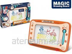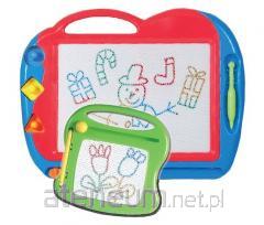 Duży Znikopis Turkusowy ze Stempelkami Tablica magnetyczna jest rewelacyjną zabawką, którą znają prawdopodobnie wszyscy - dzieci, ich rodzice i dziadkowie. Znikopis jest bardzo prostą, acz funkcjonalną zabawką - służy do pisania i rysowania w nieskończoność - liczba dzieł dziecka jest nieograniczona. Tablica magnetyczna jest również doskonałą formą zabawy połączonej z funkcją edukacyjną. Zabawka rozwija umysł i zmysł estetyczny, a także umiejętności plastyczne i manualne dziecka. Prezentowany zestaw składa się z tablicy, rysika i trzech stempelków w kształcie kółka, łapki i kwiatka. Duża tablica magnetyczna składa się z neutralnej, przyjemnej kolorystyki - klasyczne barwy spodobają się zarówno dziewczynkom, jak i chłopcom. U góry tablicy znajduje się uchwyt ułatwiający przenoszenie zabawki. Znikopis wyposażony jest w duży ekran, który umożliwia tworzenie wielokolorowych, niesamowicie oryginalnych obrazków, które w prosty sposób można zmazać. Pod powierzchnią ekranu tablicy znajdują się opiłki żelaza, które w trakcie rysowania dołączonym do zestawu, specjalnym rysikiem, układają się w stworzony przez dziecko wzór. Dołączone do zestawu stempelki ułatwiają zabawę - odbite na ekraniku mogą być wzorem, który dziecko ozdabia według własnego pomysłu. Wymiary zabawki: - znikopis: 38,5cm x 26cm, - ekran: 23,5 cm x 15,5cm, Wymiary opakowania: 48 cm x 31 cm x 4,5 cm