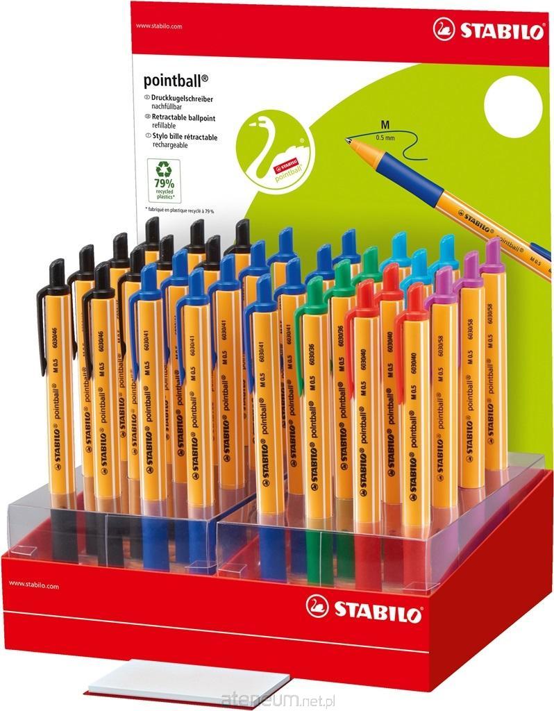 STABILO pointball - automatyczny długopis. Jest neutralny pod względem emisji CO2, ponieważ dwutlenek węgla powstały przy jego produkcji został całkowicie skompensowany - dla wszystkich tych, którym troska o środowisko nie jest obojętna. Posiada pomarańczową obudowę w charakterystyczne dla STABILO jasne pasy oraz gumowany uchwyt i klips w kolorze wkładu. Grubość linii pisania 0,5 mm. Wkłady w kolorze niebieskim, zielonym i czarnym posiadają nieblaknący tusz (document-proof). W ofercie dostępne są również wymienne wkłady. Kartonowy display zawierający 32 szt. w 6 kolorach. Wymiary displaya 189x148x250 mm.