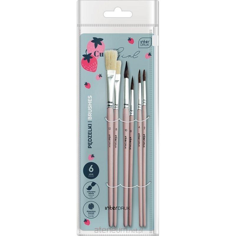 Zestaw 6 drewnianych pędzelków o różnych szerokościach i kształtach końcówek. Praktyczne etui z zamknięciem strunowym. Naturalne włosie. Trzonek z malowanego drewna.