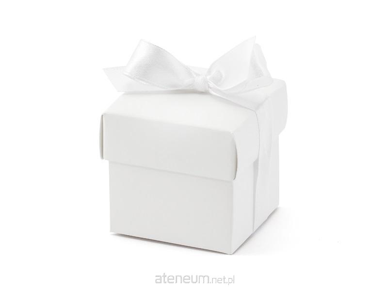 Pudełeczka wykonane z papieru w kolorze białym, z satynową tasiemką, idealne na prezenciki dla gości, wymiary po złożeniu 5,2x5,2x5,2 centymetra.(1 op. / 10 szt.)