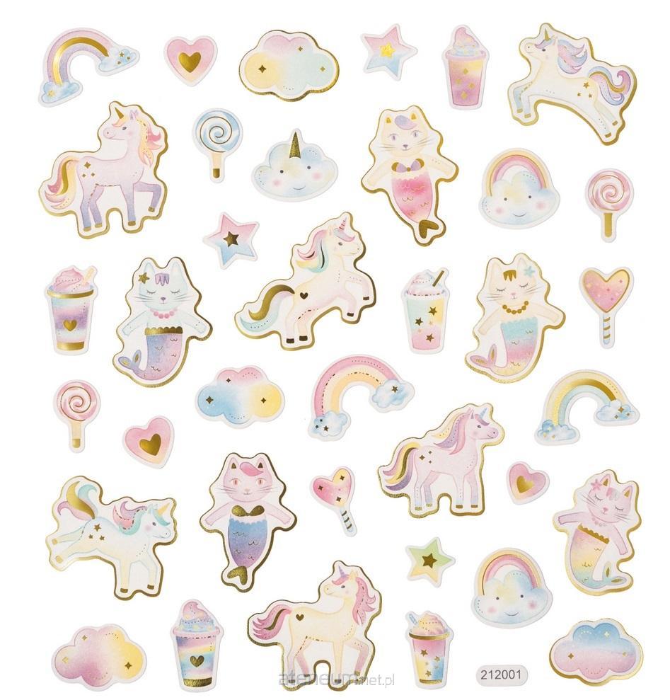 aklejki z jednorożcami, tęczami i kotkami-syrenkami. Uroku i blasku dodają im pastelowa kolorystyka, perłowy papier i złocenia.