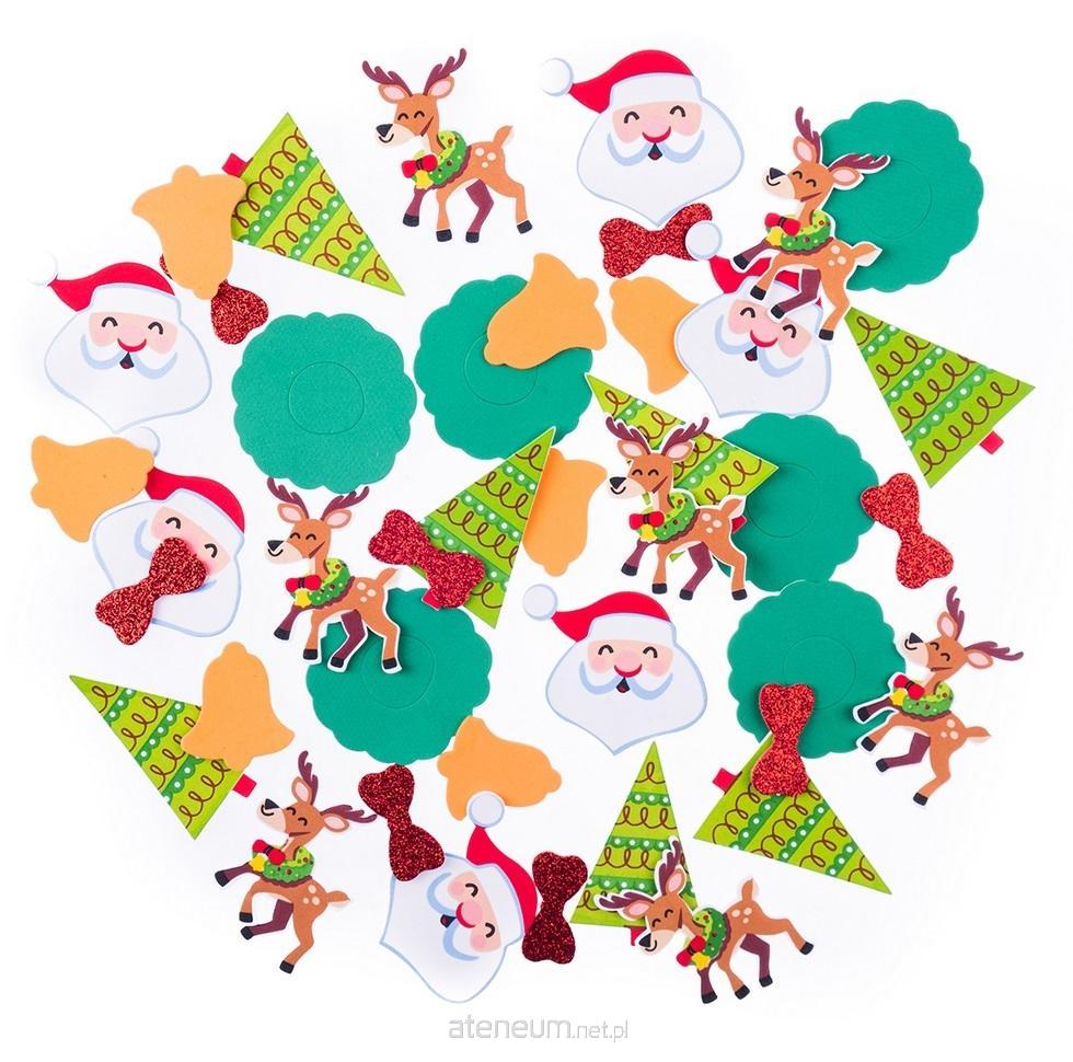 Naklejki z pianki ze świątecznymi motywami Mikołaja, choinki, renifera, dzwonka, wieńca i brokatowej kokardki. Idealnie sprawdzą się w twóczości dzieci oraz pobudzą ich kreatywność.