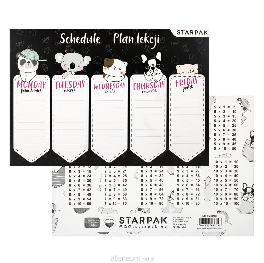 Plan lekcji jest niezbędnym elementem wyposażenia szkolnej wyprawki. Plan z kolekcji STARPAK Minisy zawiera podział na pięć dni tygodnia z 8 wierszami do wpisu, dzięki czemu żaden uczeń nie zapomni o potrzebnych mu danego dnia książkach czy zeszytach, dodatkowo na odwrotnej stronie posiada tabliczkę mnożenia. Przyjazna grafika sprawi, że każdy dzień w szkole będzie dobrze zaplanowany i udany. Zapoznaj się również z innymi produktami Starpak! Plan lekcji wykonany z papieru.