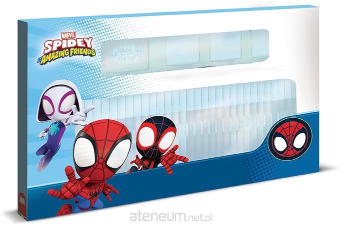 Pieczątki na licencji Spidey. W skład zestawu wchodzą: 3 drewniano-gumowe pieczątki, 1 poduszeczka do tuszu, 36 pisaków oraz książeczka z aktywnościami.