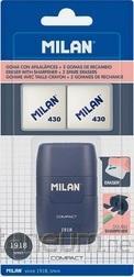 Fantazyjne połączenie gumki i temperówki w jednym. Z jednej strony podwójna temperówka na cienkie i grube kredki i ołówki. Z drugiej miękka gumka z syntetycznego kauczuku, a po środku pojemnik na ścinki. Seria COMPACT 1918, kolor granatowy. Ma ostre i wytrzymałe ostrza ze stali węglowej dzięki czemu idealnie nadaje się do wszystkich rodzajów ołówków. Posiada system bezpiecznych ostrzy, który zapobiega odłączeniu się ostrza od korpusu temperówki. Oryginalny produkt stworzony przez własny dział badawczo-rozwojowy MILAN. Rozmiar temperówko-gumki: 6,7 x 4 x 2,5 cm. W zestawie 2 dodatkowe zapasowe gumki 430.