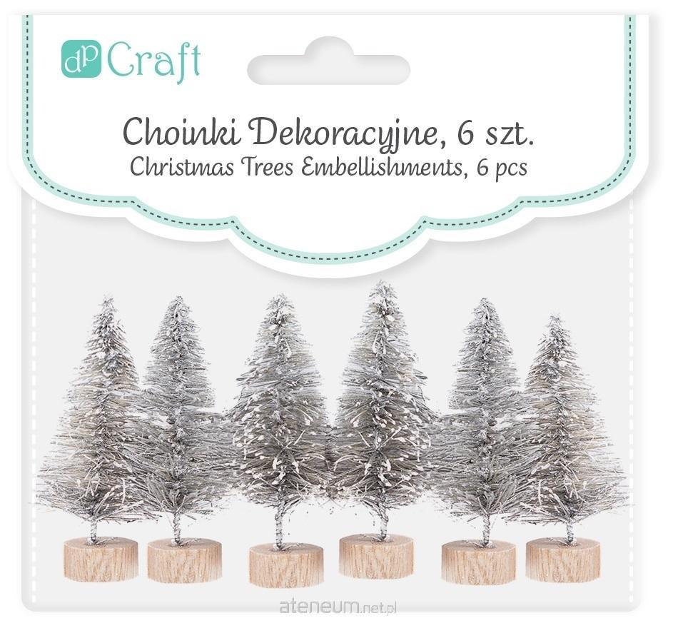 Dekoracyjne choinki z plastycznego drucika na plastikowej podstawce. Drucik w kolorze srebrnym, pobielony białą farbą imitującą śnieg.