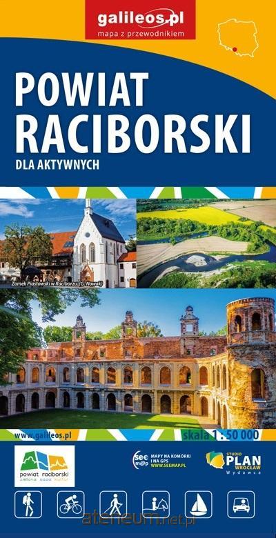 Mapa powiatu raciborskiego, w skład którego wchodzą gminy: Racibórz, Kornowac, Nędza, Kuźnia Raciborska, Rudnik, Pietrowice Wielkie, Krzanowice, Krzyżanowice. Szczególnie atrakcyjne miejsca zaznaczono żółtą ramką. Podano aktualne przebiegi szlaków pieszych, rowerowych i dydaktycznych, łącznie z kilometrażem, co pozwala łatwiej zaplanować wycieczkę. Za pomocą wyraźnych, charakterystycznych znaków wskazano miejsca, gdzie można aktywnie spędzić wolny czas.