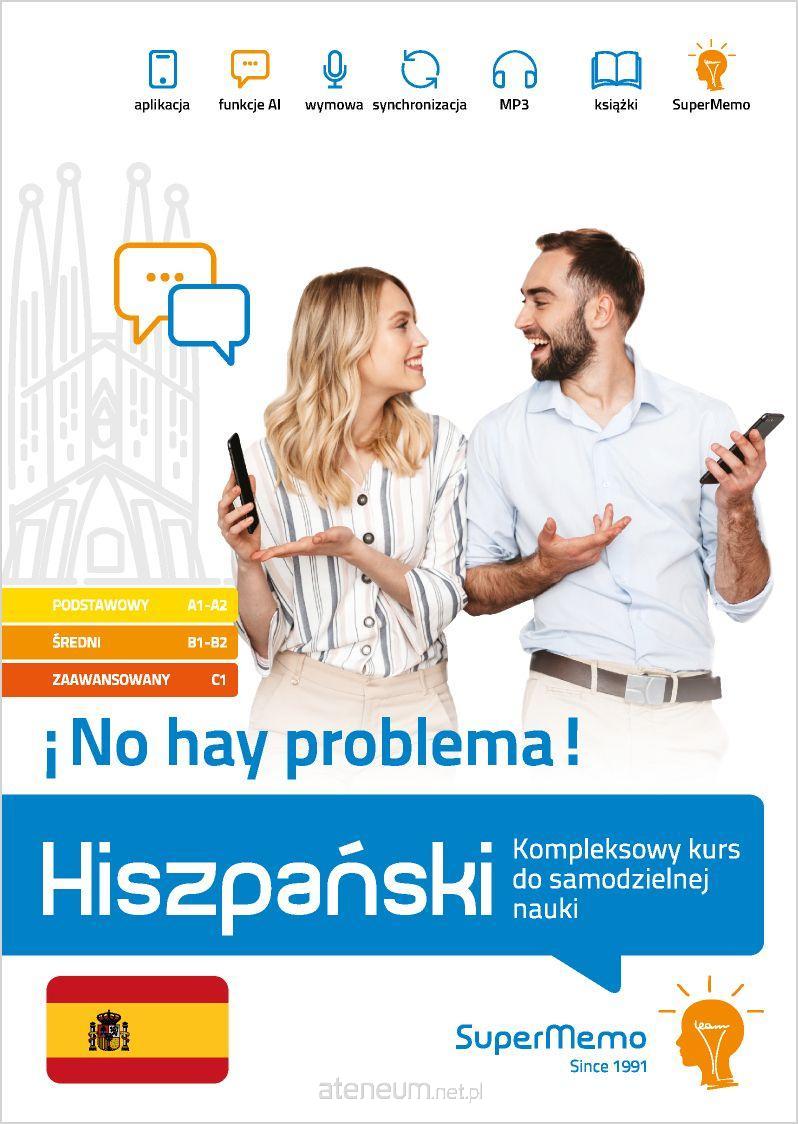 Hiszpański. ¡No hay problema! to zawierający 720 stron komplet podręczników z kursem języka hiszpańskiego do samodzielnej nauki. Dzięki niemu poznasz najważniejsze słowa i struktury gramatyczne, dotyczące m.in. pracy, podróży, współczesnego świata, kultury i sztuki. Publikacja obejmuje również nagrania MP3 oraz ćwiczenia, które w serwisie i aplikacji wspiera oryginalna metoda inteligentnych powtórek SuperMemo.