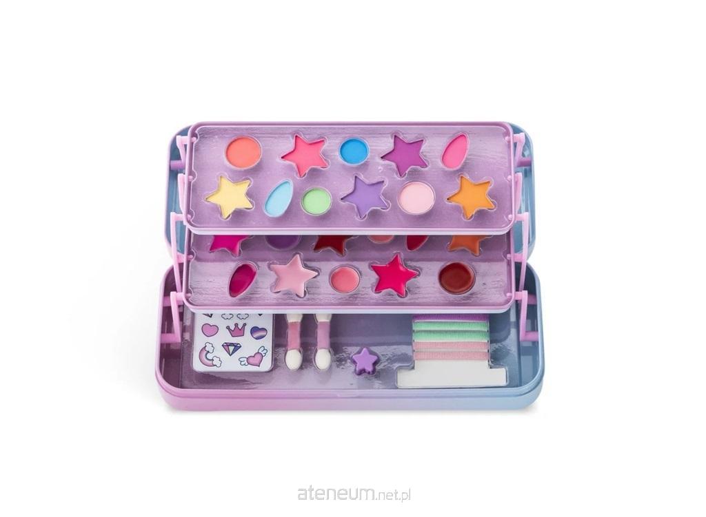 Zestaw kosmetyków dla dzieci zawiera: 11 cieni do powiek, 11 błyszczyków, 2 aplikatory, naklejki, 2 gumki do włosów i dwie spinki .