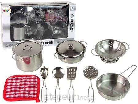 Zestaw Garnków i Akcesoriów Kuchennych Dla Dzieci Nasz zestaw metalowych garnków i akcesoriów kuchennych to idealna zabawka dla małych kucharzy. W zestawie znajdziesz wszystko, co potrzebne do odgrywania wspaniałych scenek kulinarnej twórczości. Wszystkie akcesoria kuchenne wykończone w srebrnym kolorze, co dodaje im realistycznego wyglądu. Nasz zestaw doskonale wspiera rozwijanie wyobraźni oraz umiejętności kulinarnej zabawy. Zestaw zawiera: -Duży garnek o wysokości 7 cm i średnicy 9,5 cm z pokrywką, -Mniejszy garnek o wysokości 3 cm i średnicy 10 cm z pokrywką, -Durszlak o wysokości 4,5 cm i średnicy 10 cm, -Patelnia o wysokości 2,5 cm i średnicy 10 cm. Dodatkowo, w zestawie znajdują się akcesoria ( długość 13 cm ): - Czerwono-biała ściereczka, -Szpatułka, -Łyżka do wyciągania makaronu, -Łyżka z dziurkami, -Łyżka do zupy, Daj swojemu dziecku możliwość tworzenia wspaniałych kulinarnych opowieści z naszym zestawem garnków i akcesoriów. Przygotuj się na smaczne przygody w miniaturze! Wymiary opakowania: 38 cm x 22 cm x 12 cm Posiada certyfikat CE, ponadto jest zgodny z normą EN71. Zabawka przeznaczona jest dla dzieci powyżej 3 roku życia.