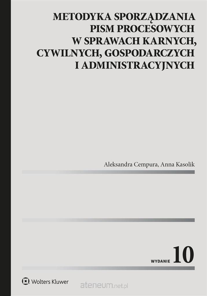 Publikacja zawiera przystępne omówienie wielu rodzajów pism - nie tylko wszczynających postępowanie, lecz także stanowiących środki odwoławcze od wydanych rozstrzygnięć. Zaprezentowano w niej najważniejsze pisma procesowe: pozwy, apelacje, akty oskarżenia sporządzane w toku postępowań oraz propozycje czynności, które należy podjąć w celu ich poprawnego i skutecznego wniesienia. Wzory pism przedstawiono w sposób praktyczny, z objaśnieniem i wskazaniem przykładów czynności podejmowanych w określonych sytuacjach procesowych. Objaśnienia prowadzą czytelnika krok po kroku tak, aby w sposób należyty mógł przygotować własne pismo według uniwersalnego wzoru. 10. wydanie uwzględnia zmiany dotyczące m.in.: uzupełnienia treści aktu oskarżenia o informację o złożonym przez oskarżonego oświadczeniu o wyrażeniu zgody na dokonywanie doręczeń na adres do doręczeń elektronicznych, umożliwienia oskarżonemu w toku przesłuchania złożenia wyjaśnień na piśmie, zamieszczenia kopii orzeczenia lub zarządzenia w systemie teleinformatycznym, rozwiązań wyznaczających dolną granicę wymiaru kar nieizolacyjnych - grzywny oraz ograniczenia wolności, w przypadku gdy sankcja przepisu karnego przewiduje zagrożenie alternatywne przynajmniej jedną z tych kar oraz karą pozbawienia wolności, ostateczności decyzji wydanej w pierwszej instancji, od której uzasadnienia organ odstąpił z powodu uwzględnienia w całości żądania strony, podziału sumy uzyskanej z egzekucyjnej sprzedaży nieruchomości, podniesienia wartości przedmiotu sporu, która stanowi o rozpoznaniu sprawy przez sąd okręgowy, poszerzenia katalogu niedopuszczalnych wniosków o wyłączenie sędziego, rezygnacji z górnego pułapu zwrotu kosztów przejazdu i przyjęcia zasady, że poniesione wydatki podlegają rozliczeniu w pełnym zakresie, złagodzenia rygorów dotyczących udziału w posiedzeniu przygotowawczym, możliwości skierowania sprawy prosto na posiedzenie niejawne, celem wydania wyroku, w sytuacji gdy nie udało się w sposób ugodowy rozwiązać sporu, a zgromadzony w sprawie materiał dowodowy jest wystarczający do rozstrzygnięcia sprawy, modyfikacji normatywnego kształtu planu rozprawy, możliwości zamknięcia rozprawy na posiedzeniu niejawnym, dodatkowych przesłanek, stanowiących o niedopuszczalności skargi o wznowienie postępowania, nowego postępowania odrębnego - postępowania z udziałem konsumentów, wprowadzają dodatkowe uproszczenia w odniesieniu do spraw o wartości przedmiotu sporu do 4000 zł charakteru postępowania uproszczonego, usprawnienia postępowania odwoławczego w sprawach rozpoznawanych w postępowaniu uproszczonym. W opracowaniu zawarto ponadto orzecznictwo Sądu Najwyższego, a także orzecznictwo sądów apelacyjnych, które ukształtowało praktykę interpretacji poszczególnych żądań procesowych, składanych wniosków dowodowych oraz zarzutów apelacyjnych wzbudzających wątpliwości w określonych sytuacjach. Publikacja przeznaczona jest w szczególności dla aplikantów, którzy podczas odbywania aplikacji powinni zdobyć podstawową wiedzę o technice sporządzania pism procesowych, aby później doskonalić się w tej materii. Opracowanie zainteresuje również prawników praktyków, mających szansę ulepszyć wypracowane już techniki lub zwrócić uwagę na te elementy, które dotychczas były pomijane.