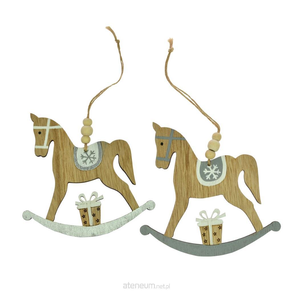 Elegancka drewniana zawieszka dekoracyjna w kształcie konika na biegunach. Zawieszka utrzymana w minimalistycznej tonacji kolorystycznej, z bielą i szarością. Dekoracja zawiera elementy malowane: bieguny, siodło, prezent. Ozdoba wyposażona w naturalny sznurek z koralikiem umożliwiający zawieszenie. Wymiary dekoracji: 11 cm.