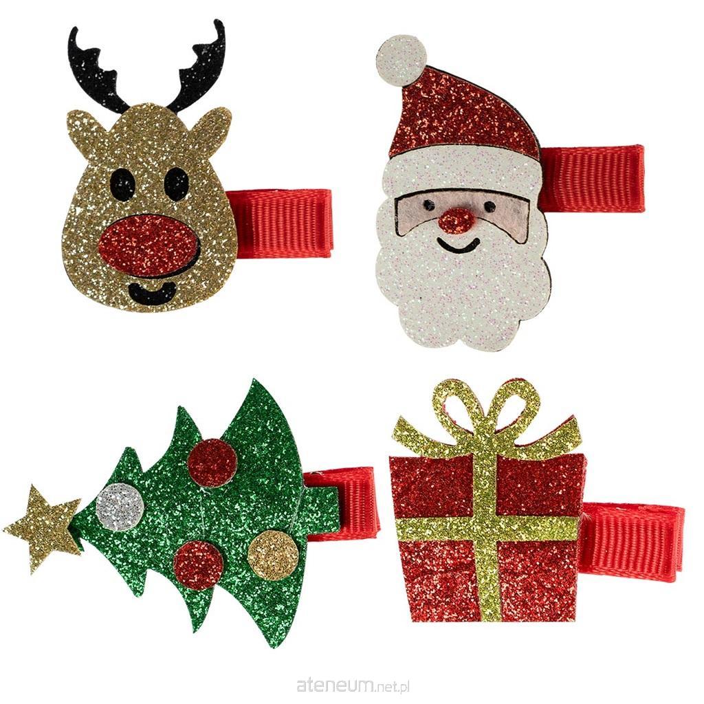 Spinki do włosów ze świątecznymi motywami. Elementy pokryte brokatem pięknie się mienią w świetle. Idealny mały świąteczny dodatek do stroju na Mikołajki lub na święta. Wymiary produktu: 3x3, 5-4 cm (w zależności od wzoru). W opakowaniu znajdują się 2 spinki. Dostępne wzory: mikołaj i renifer, choinka i prezent.