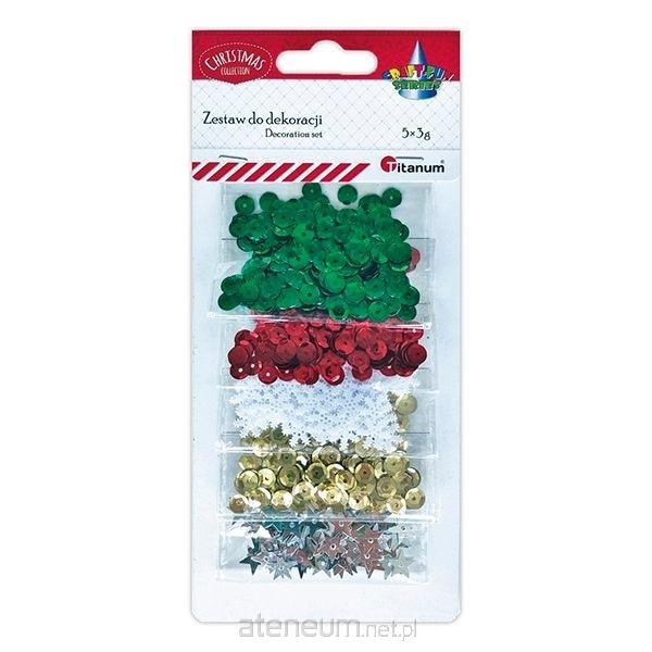 Zestaw cekinów 5 wzorów i kolorów x 3 g, okrągłe 7 mm zielone, czerwone, złote, płatki śniegu 11 mm białe, gwiazdki 10 mm srebrne.