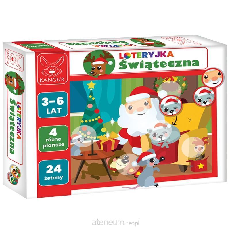 Loteryjka świąteczna - odkryjmy razem magię świąt! Jedna z pierwszych gier proponowanych dla dzieci w wieku od 3 lat. Gra zawiera cztery kolorowe ilustracje oraz przygotowane do ilustracji 24 kolorowe żetony. Maluchy układają żetony na świątecznych planszach. Dziecko znajduje odpowiednie miejsce dla żetonu i widzi cała ilustrację.