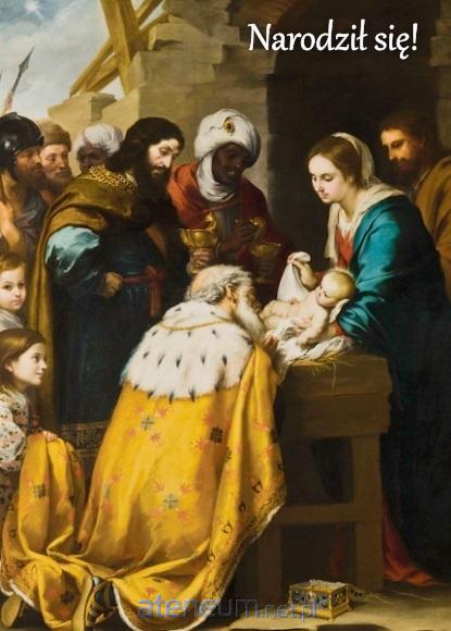 Kartka bożonarodzeniowa z preprodukcją obrazu Pokłon mędrców, autorBartolom Esteban Murillo.