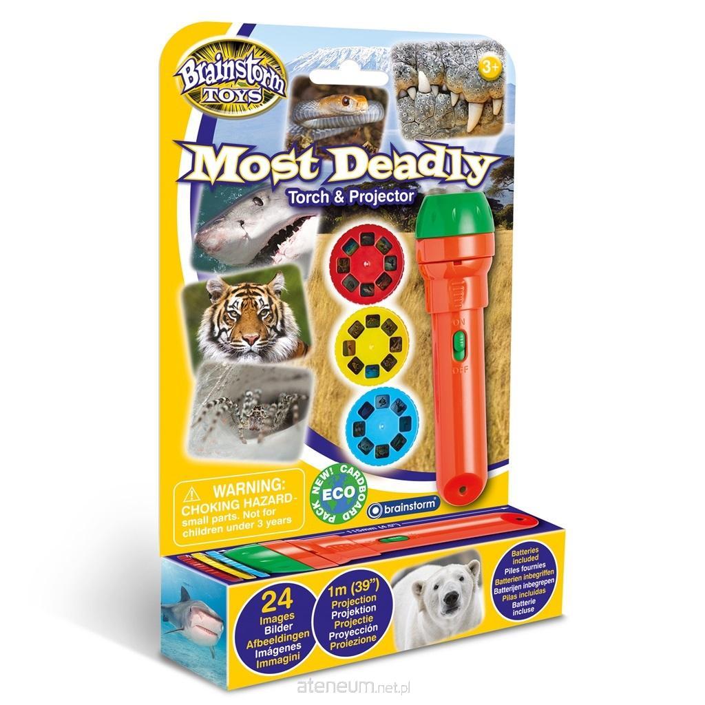 Wprowadź najbardziej zabójcze zwierzęta świata do swojego pokoju. Wystarczy poświecić latarką/ projrktorem w całym pokoju i obejrzeć przerażające obrazy rekinów, pająków, hipopotamów, węży i ??nie tylko.Świetny towarzysz przed snem, który sprawi, że zasypianie będzie przyjemniejsze. Latarka posiada 3 dyski slajdów zawierającymi 24 kolorowe zdjęcia najbardziej zabójczych zwierząt. Łatwo wymieniaj i zmieniaj slajdy, odciągając plastikową klapkę i wkładając wybrany dysk, a następnie obracaj dysk, aby oglądać fantastyczne kolorowe obrazy o szerokości do jednego metra. Obrazy można łatwo ustawić, obracając głowicę obiektywu. Ten produkt może być używany jako zwykła latarka bez założonych prowadnic i doskonale nadaje się do trzymania na stolikach nocnych, aby zapewnić dzieciom komfort w nocy. Latarka ma 11 cm długości i około 3,5 cm średnicy w najszerszym miejscu. Zasilana bateriam i- 3 x LR44 załączonymi w zestawie.