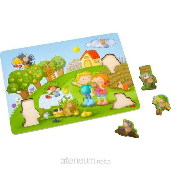 Puzzle nakładane W ogrodzie zaprojektowano tak, by pasowały do popularnej klasyki gier dla dzieci. Nie zabrakło tutaj kruka Theo grasującego w sadzie pełnym owoców. Starannie ilustrowane motywy zachęcają do odkrywania i zabawy. Układanie puzzli jest dla dziecka o wiele wygodniejsze dzięki dużym, poręcznym gałkom. Głównym wyzwaniem w tej wersji układanki W ogrodzie jest ułożenie 8. drewnianych elementów w ramie o wymiarach 30 x 21 cm.