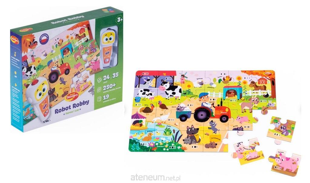 Robot Robby zaprasza na zabawę w układanie i odkrywanie! Pierwszy etap zabawy polega na ułożeniu dwóch obrazków ze znajdujących się w zestawie puzzli. Gdy już maluch upora się z tym zadaniem, do gry wkroczy wesoły robocik, który przygotował dla najmłodszych ponad 350 dźwięków i aż 16 różnych gier, a wśród nich szukanie zwierzątek na obrazku, dopasowywanie ich odgłosów, odtwarzanie sekwencji i rozpoznawanie domków zwierzaków. Dźwięki pochowane są w 32. aktywnych polach, oznaczonych kodem kreskowym. Aby robot prawidłowo odczytał pole, należy delikatnie przycisnąć końcówkę robota do kodu kreskowego, umieszczając robota pionowo nad polem