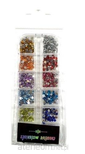 Kryształki z płaskim spodem wykonane z przezroczystego tworzywa sztucznego w kształcie kolistym. Spód srebrny metalizowany. Opakowanie z eurozawieszką zawiera miks elementów wielkości 4 mm w 12 różnych kolorach umieszczone w plastikowym pojemniku z 12 przegródkami.