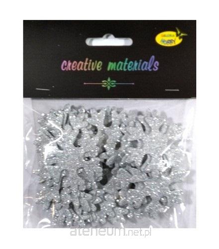 Zestaw elementów w formie śnieżynek z pianki brokatowej wielkości 50 mm , zawierający ok. 30 elementów, pakowany w eleganckie opakowanie z eurozawieszką. Elementy można naklejać na każdą powierzchnię lub używać do innych zdobień.Opakowanie zawiera elementy w kolorze srebrnym.