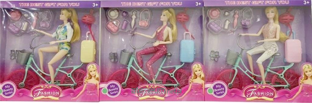 Lalka na rowerze w zestawie z akcesoriami podróżniczymi jak: walizka, aparat fotograficzny, torebka, kapelusz, parasol. Produkt zapakowany w kartonowe opakowanie z przezroczystym okienkiem. Zabawka dla dzieci od 3 lat. Podane wymiary są wymiarami opakowania.