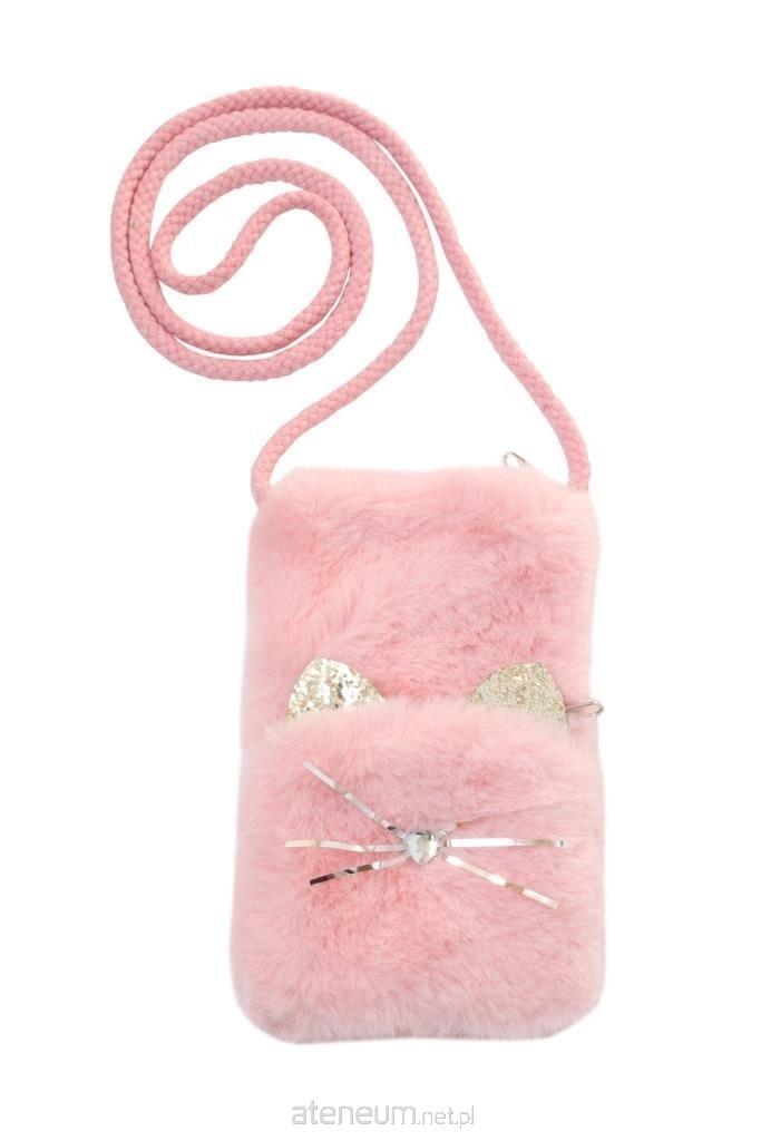 Torebka na telefon kotek. Główna komora zamykana na zamek, z dodatkową kieszonka na drobiazgi. Kolor różowy ze złotymi elementami.