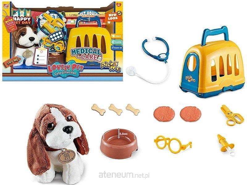 Piesek z klatką do przenoszenia, z akcesoriami; 46x30x16cm, W/B