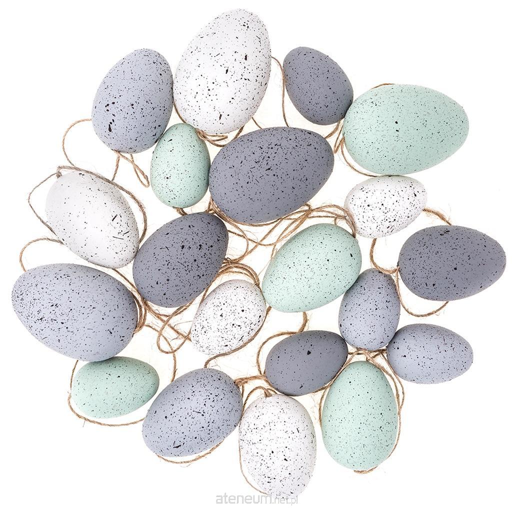 Elegancki zestaw delikatnie nakrapianych jajek z zawieszką, w stonowanych odcieniach szarości i mięty.