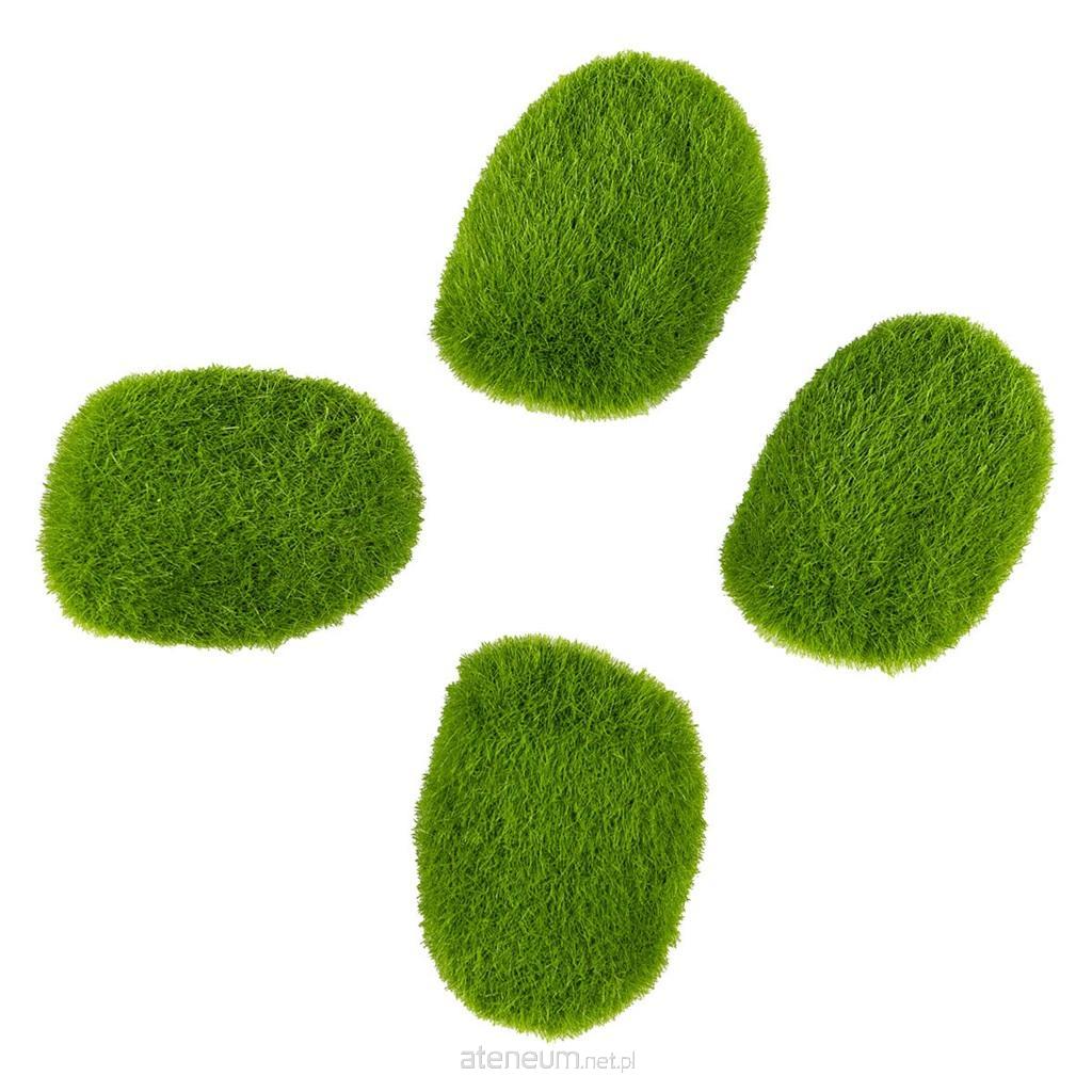 Dekoracja wyglądająca jak kamienie pokryte mchem w kolorze zielonym. Idealne do tworzenia kompozycji, ozdób DIY lub makiet. W opakowaniu znajdują się 4 sztuki. Ozdoby w rozmiarze około 5x4 cm.