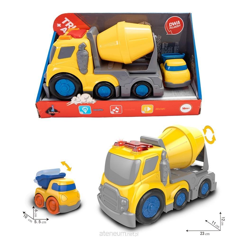Zestaw autek 2w1 Betoniarka i mini wywrotka Betoniarka z napędem friction (23x11x12 cm) Mini wywrotka (10x5.5x6 cm) Efekty świetlne i dźwiękowe Zasilanie: 2xAA (brak w zestawie)