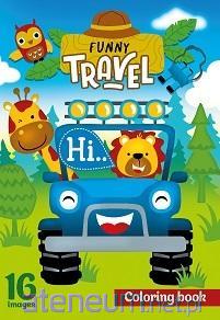 Kolorowanka dla dzieci. Na każdym z 16 obrazków znajdują się podróżujące zwierzaki. Wyprodukowana na Ukrainie.