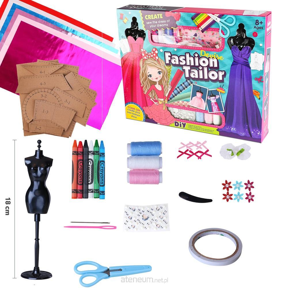 Zestaw do projektowania sukienek W zestawie kawałki materiałów, 2 manekiny, nici, nożyczki, kredki, kokardki, taśma, dżety, wykrojniki Wymiary opakowania: 40.5x6.6x31 cm