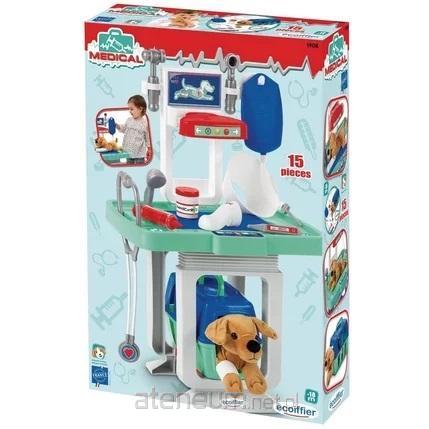 Zestaw zawiera 15 akcesoriów młodego weterynarza w tym pluszowego pieska, stolik do badań, kontenerek, stetoskop i kroplówkę. Wyprodukowane we Francji.