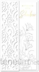 Składany z trzech stron kwadratowy karnet o wymiarach 15 x 15 cm z wyciętym elementem na froncie. Złocony i tłoczony, teksy życzeń w środku. Wydrukowany na wysokiej jakości papierze. W zestawie bilecik do prezentu oraz koperta.