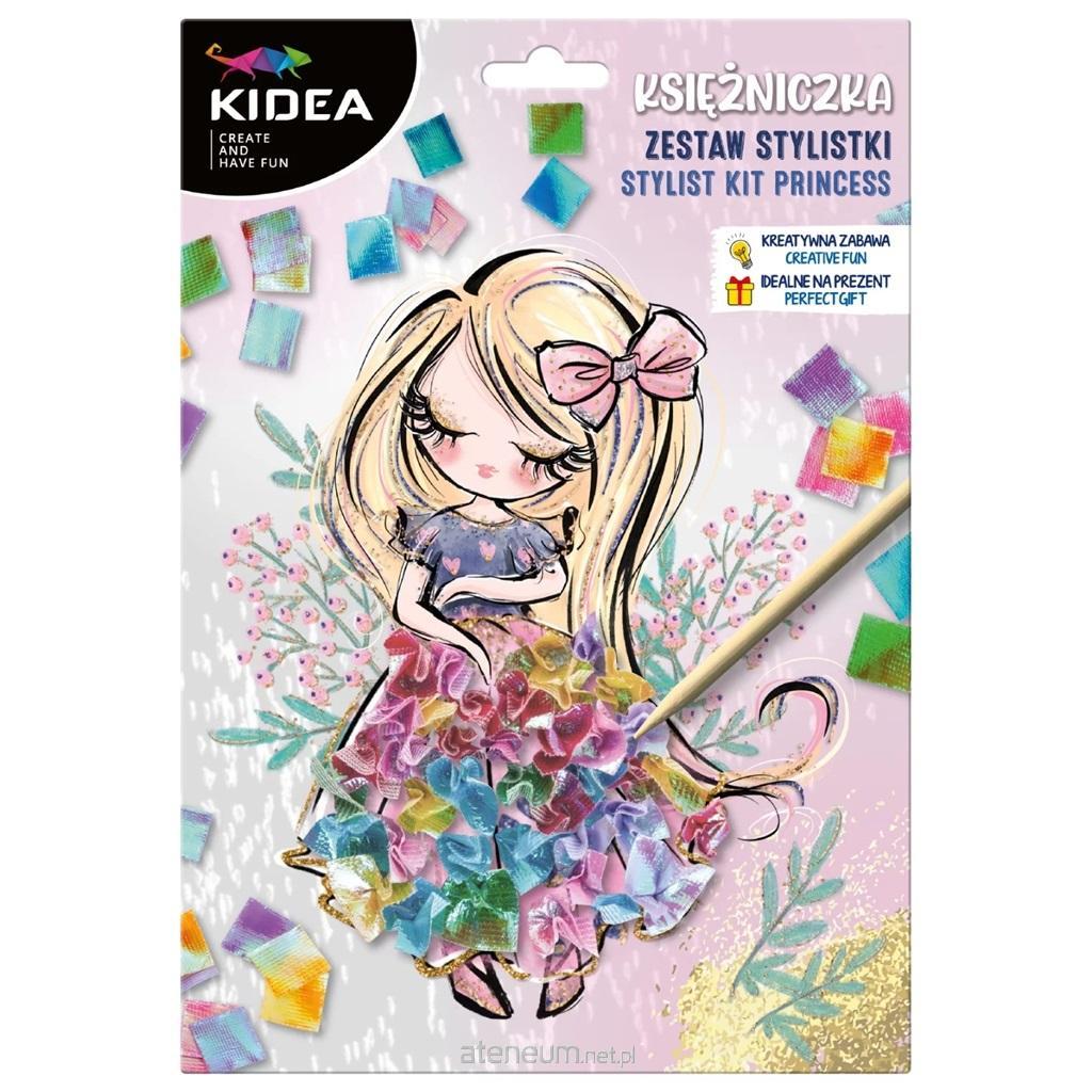 Świat mody stoi otworem przed małymi projektantkami dzięki kreatywnej zabawie Stylistka od Kidea. W opakowaniu znajdują się cztery szablony z dużymi naklejkami z księżniczkami, drewniany patyczek oraz metaliczne kawałki materiału w różnych kolorach. Aby ubrać księżniczki w błyszczące kreacje wystarczy wcisnąć kawałki materiału w miejsca oznaczone krzyżykiem i gotowe! Zestawiając ze sobą różne kolory materiałów można tworzyć wielobarwne kreacje lub postawić na bardziej stonowane, jednolite stylizacje. Kiedy stworzony strój już się znudzi wystarczy wyjąć skrawki materiału z otworów i zacząć zabawę na nowo! Wystylizowane księżniczki można wyjąć z szablonu i przykleić lub bawić się nimi tworząc niesamowite historie.