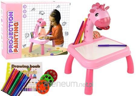 STOLIK DINOZAUR Z PROJEKTOREM DO RYSOWANIA + AKCESORIA KOLOR RÓŻOWY Dziecięcy projektor jest rewelacyjnym gadżetem dla wszystkich dzieci, które uwielbiają rysować i malować ! Rzutnik kryje w sobie aż 3 różnorodne funkcje, co jest gwarancją niekończącej się zabawy. Rysuj, pisz i zmazuj, wspaniała twórcza zabawa i nauka bez końca. Zestaw zawiera wszystko czego potrzebuje maluszek do kreatywnej zabawy. Tablica służy do pisania i rysowania mazakami suchościeralnymi. Za pomocą projektora dziecko może kopiować obrazki z dołączonych 24 wzorów tworząc tym niecodzienne ozdoby i tła do zabawy a przede wszystkim kreować własne, oryginalne prace. W zestawie znajdują się 3 dyski z 8 wzorami obrazków czyli razem 24 wzory, 12 mazaków w najpotrzebniejszych kolorach ,gąbka do zmazywania obrazków oraz dodatkowy blok papierowy do malowania. Projektor posiada włącznik on/off. Główka jest ruchoma (góra-dół), natomiast całe ramie można przesuwać w lewo i prawo. Po przesunięciu włącznika raz oświeca się światło, a po przesunięciu drugi raz uruchamiają się melodyjki. Dzięki temu można malować z muzyką, albo bez. Projektor gra 12 różnych melodyjek. Pod spodem główki znajduje się regulacja ostrości obrazu. Rzutnik posiada zdejmowane nóżki, dzięki czemu można go pochylić lub na płasko postawić na biurku. Z projektorem rysowanie staje się o wiele fajniejsze! Wystarczy włożyć dysk w szczelinę projektora i przycisnąć przycisk aby włączyć rzutnik. Po włączeniu projektora zaświeca się światełko, po włożeniu krążka wyświetlają się slajdy. Slajdy można wyświetlać na podstawie projektora i odrysowywać w notesiku albo bezpośrednio na podstawie. Do odrysowania mamy aż 24 ładne, kolorowe obrazki takie jak zwierzęta, pojazdy ,warzywa czy owoce. Na podstawie można bezpośrednio malować mazakami, rysunki zmazujemy ściereczką, która również jest w zestawie. Można również skierować projektor na ścianę i wyświetlać na ścianie slajdy. Projektor może również pełnić funkcję lampki. Dzięki stolikowi dziecko będzie miało zabawę na długie godziny, ćwicząc koncentracje, wyobraźnię, cierpliwość i zdolności manualne! Obrazki na slajdach: - Owoce i warzywa: jabłko, ananas, pomidorki, pomarańcze, winogrona, wiśnie, gruszka, arbuz - Zwierzęta: lew, koziołek, konik, tygrysek, małpka, słonik, żyrafa, bizon - Pojazdy: karetka, autobus, pociąg, koparka, łódź podwodna, balon, samolot, statek kosmiczny W ZESTAWIE: - Stolik z powierzchnią do malowania oraz rzutnikiem - Zestaw 12 kolorowych mazaków - 3 wkłady, każdy z 8 grafikami (owoce i warzywa, pojazdy, zwierzęta) - Zeszyt do malowania - Gąbka do ścierania Wymiary projektora: 40 cm x 31 cm x 26 cm Wymiary opakowania: 30 cm x 29 cm x 24 cm Tworzenie obrazków z użyciem projektora poprawi zdolności manualne dziecka, a także pomoże opanować precyzję i dokładność, konieczne w przyszłości podczas nauki odtwarzania szlaczków czy pisania. Rzutnik przyciągnie wszystkie dzieci do zabawy swym wyglądem - stolik z ozdobną głową dinozaura może służyć za ozdobną figurkę na biurku, kiedy dziecko nie będzie rysować.