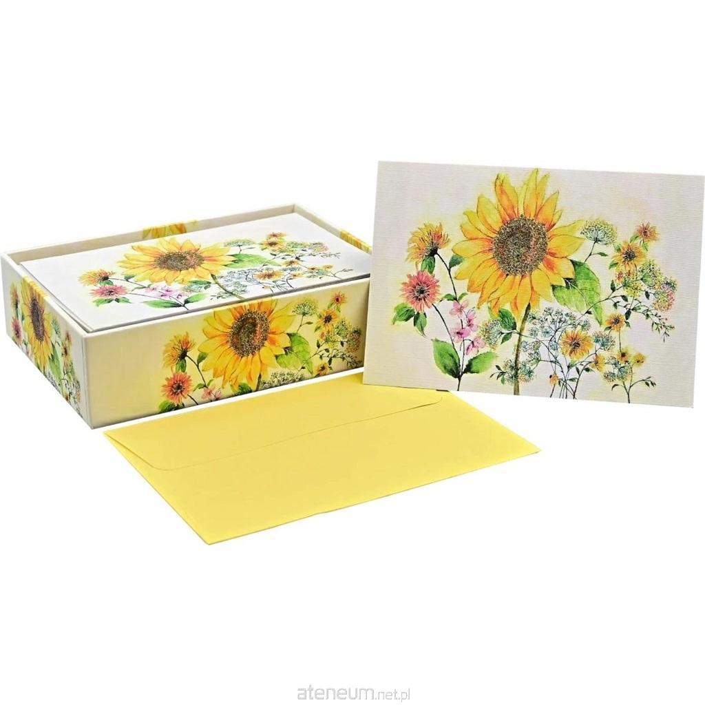 Elegancka kolekcja zdobionych karnetów na każdą okazję marki Peter Pauper Press Słoneczniki Akwarela (Watercolor Sunflower). Każda kartka posiada strukturę lnu i zdobienia ze złotej folii. Koperty są dopasowane kolorem i nadrukiem. Całość zapakowana w pudełko z tym samym wzorem. Uniwersalna otwierana kartka okolicznościowa z pustym środkiem pozwala na pełną personalizację i stworzenie wyjątkowej pamiątki dla obdarowanej osoby.