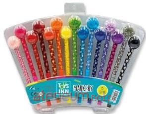 Zestaw 15 mazaków z kolorowymi pomponami. Mazaki mają intensywne barwy i są idealne do rysowania, pisania i kolorowania na papierze