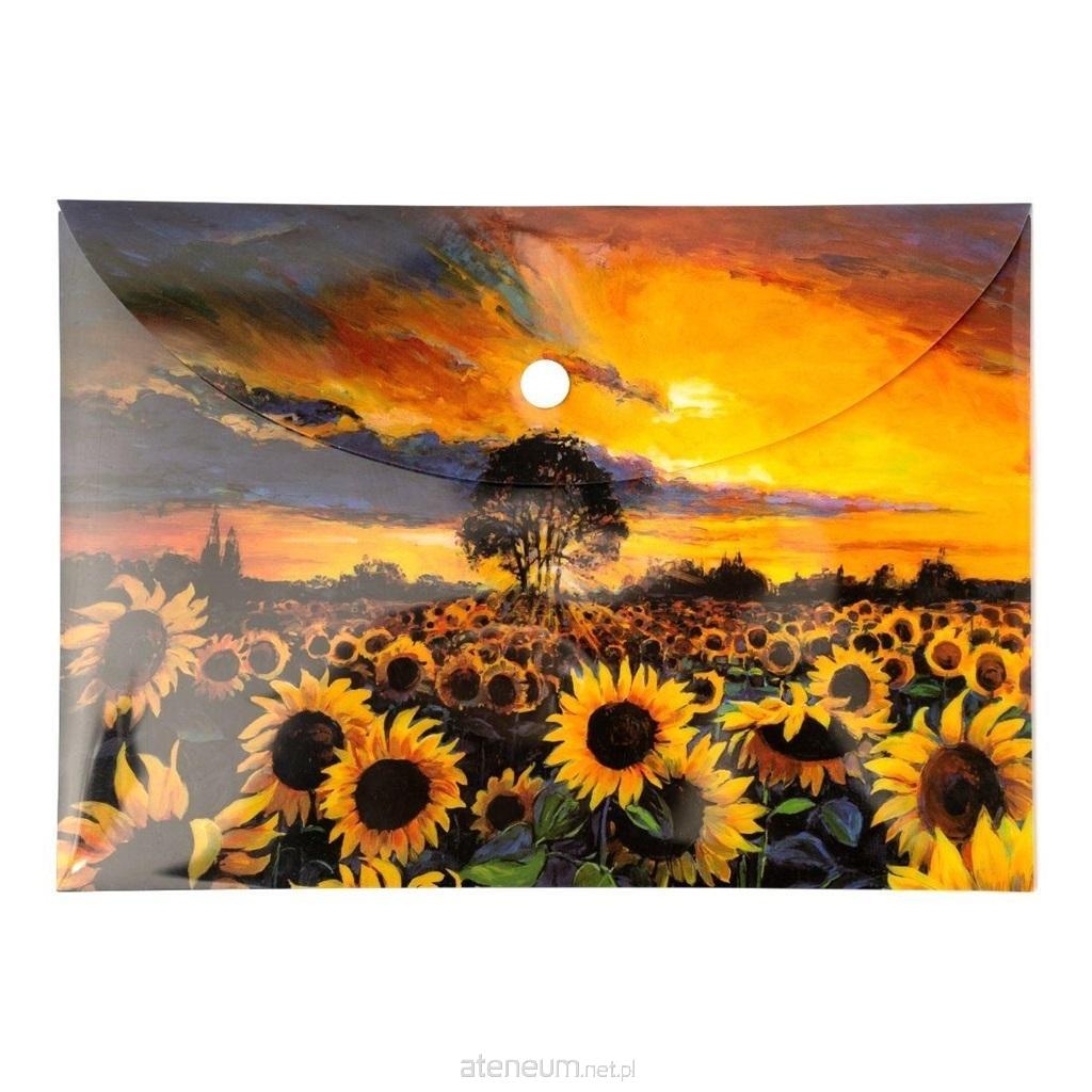 Ozdobna teczka kopertowa VISTA, wykonana z trwałego polipropylenu z nadrukiem w postaci pola słoneczników o zachodzie słońca. Zamykana na zatrzask typu napa. Dzięki pełnemu zadrukowi, zawartość teczki pozostaje niewidoczna na zewnątrz. Idealne rozwiązanie do przechowywania dokumentów lub niewielkich płaskich przedmiotów.