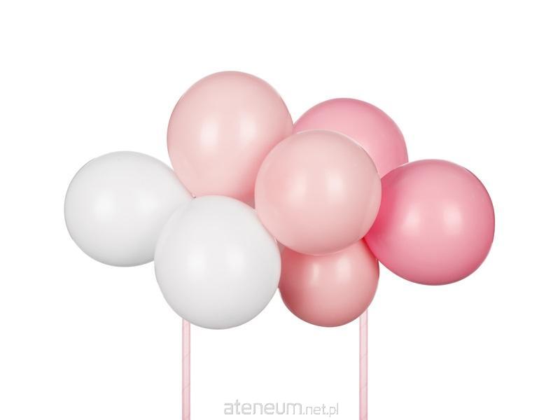Balonowy topper na tort, różowy, zestaw zawiera 10 balonów, 2 słomki i 6 kawałków taśmy, wysokość po złożeniu ok. 29 cm.
