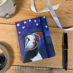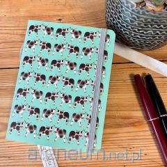 Ozdobny notatnik w formacie A5 z kartonową okładką i elastyczną gumką do zamykania. W środku znajduje się 96 stron w linie.