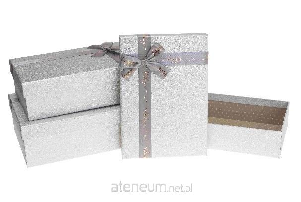 Zestaw srebrnych pudełek prezentowych z kokardą.
