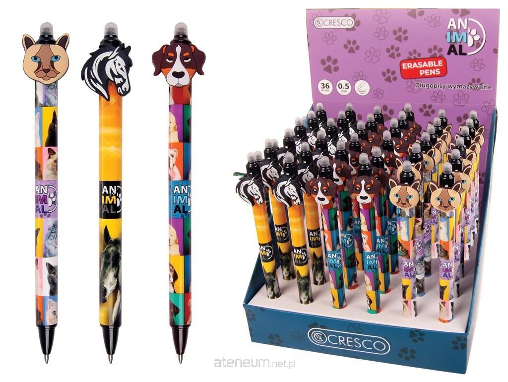 Długopis wymazywalny CRESCO o tematyce ANIMALS. Pstrykany system wysuwania niebieskiego wkładu o linii pisania 0,5mm. Opakowanie zawiera 36szt w mixie wzorów.