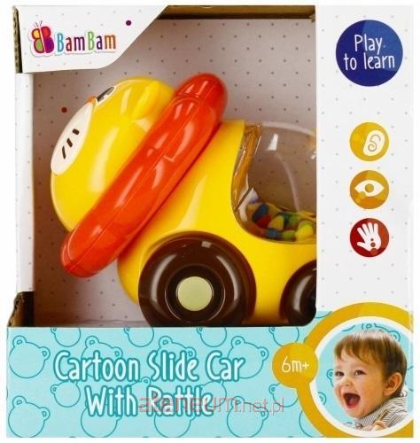 Grzechotka - Autko o kształcie uroczego LWA z obracającymi się kuleczkami w brzuszku zachwyci niejednego maluszka. Jeżdżący zwierzaczek z kuleczkami Bam Bam zapewnia masę zabawy, mobilizując dziecko do podejmowania samodzielnych prób raczkowania czy też chodzenia. Zabawka podczas poruszania wydaje szeleszczące dźwięki, dzięki tęczowym kuleczkom umieszczonym w brzuszku zwierzaczka. Dodatkowo obracające się, bajecznie kolorowe kuleczki dostarczają bodźców wzrokowych wspierając rozwój zmysłów wzroku oraz percepcji. Obły kształt ułatwia chwytanie zabawki, a kółka umożliwiają wprawianie zabawki w ruch bez trudu za pomocą pchnięcia. Wymiary/waga/baterie: wymiary produktu (dł. x wys. x gł.)[cm]: 10x9x9, wymiary opakowania (dł. x wys. x gł.)[cm]: 13x14x9, waga produktu bez opakowania [kg]: 0,11 kg, waga produktu w opakowaniu [kg]: 0,17 kg, nie wymaga zasilania bateriami. Zabawka przeznaczona dla dzieci w wieku: 6m+. Pakowana w kartonik z otwartym okienkiem.