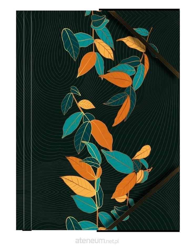 Teczka kartonowa z grafiką i gumką narożną, lakierowana, format A4. Jedna grafika - liście na czarnym tle. Gramatura: 350g. Rozmiar: 320mm/240mm