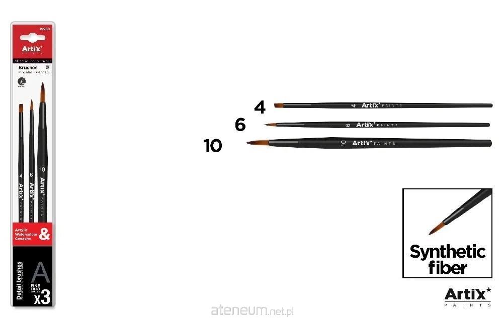 Profesjonalny pędzel do malowania z bardzo miękkiego włosia syntetycznego. Dwa bardzo cienkie pędzle z okrągłą końcówką i jeden pędzel z płaską końcówką (P) idealne do wykonywania detali lub udoskonalania wykończeni farbami akwarelowymi,temperowymi lub akrylowymi. Drewniany korpus lakierowany na czarno. Długość: 20cm. Blister po 3 sztuki: 2 pędzle z skuwką okrągłą cyfry 6 i 10 oraz pędzel z skuwką płaską cyfry 4.