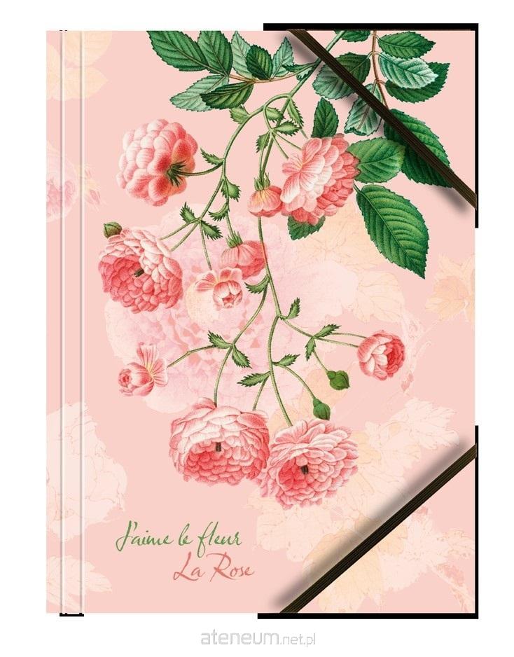 Teczka kartonowa z grafiką i gumką narożną, lakierowana, format A4. Jedna grafika róże na różowym tle. Gramatura: 350g. Rozmiar: 320mm/240mm