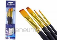 Profesjonalny pędzel do malowania z bardzo miękkiego włosia syntetycznego. Idealny do farb temperowych,olejnych lub akrylowych. Drewniany korpus lakierowany na czarno. Długość: 20,5 cm. Blister zawierający 4 sztuki: trzy z płaskimi skuwkami(1 koci język nr 15, 1 płaski nr 12 i jeden płaski wentylator) oraz 1 okrągła skuwka nr 10.